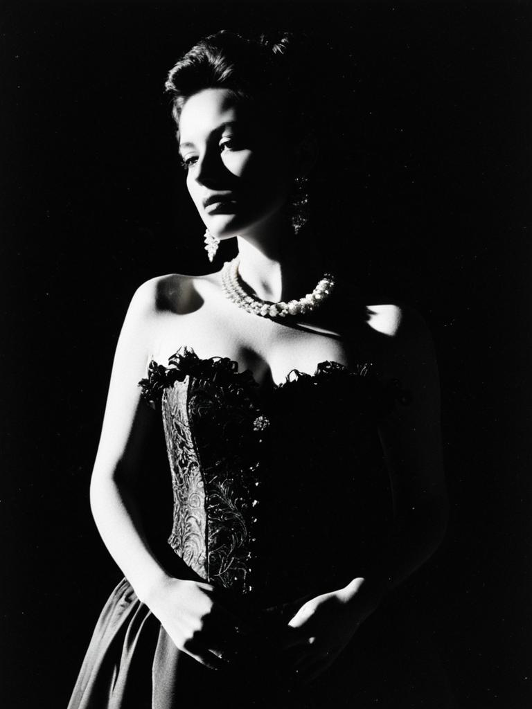 Woman in Gala Outfit, waist-up editorial fashion portrait with dramatic shadows