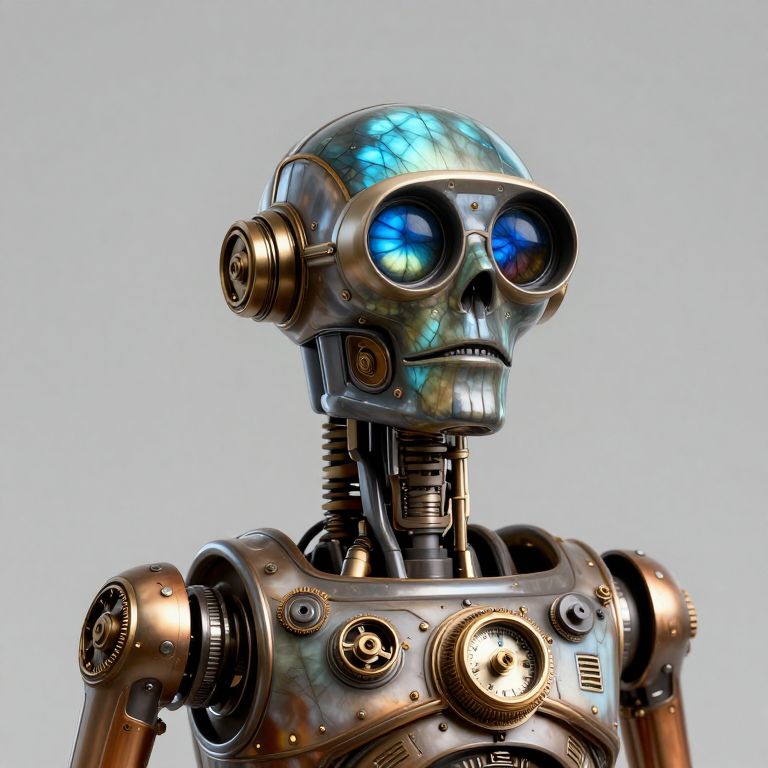 Photorealistic CGI of a metallic robot with a shiny blue-hued skull, large reflective eyes, and intricate brass-like joints against a light gray background
