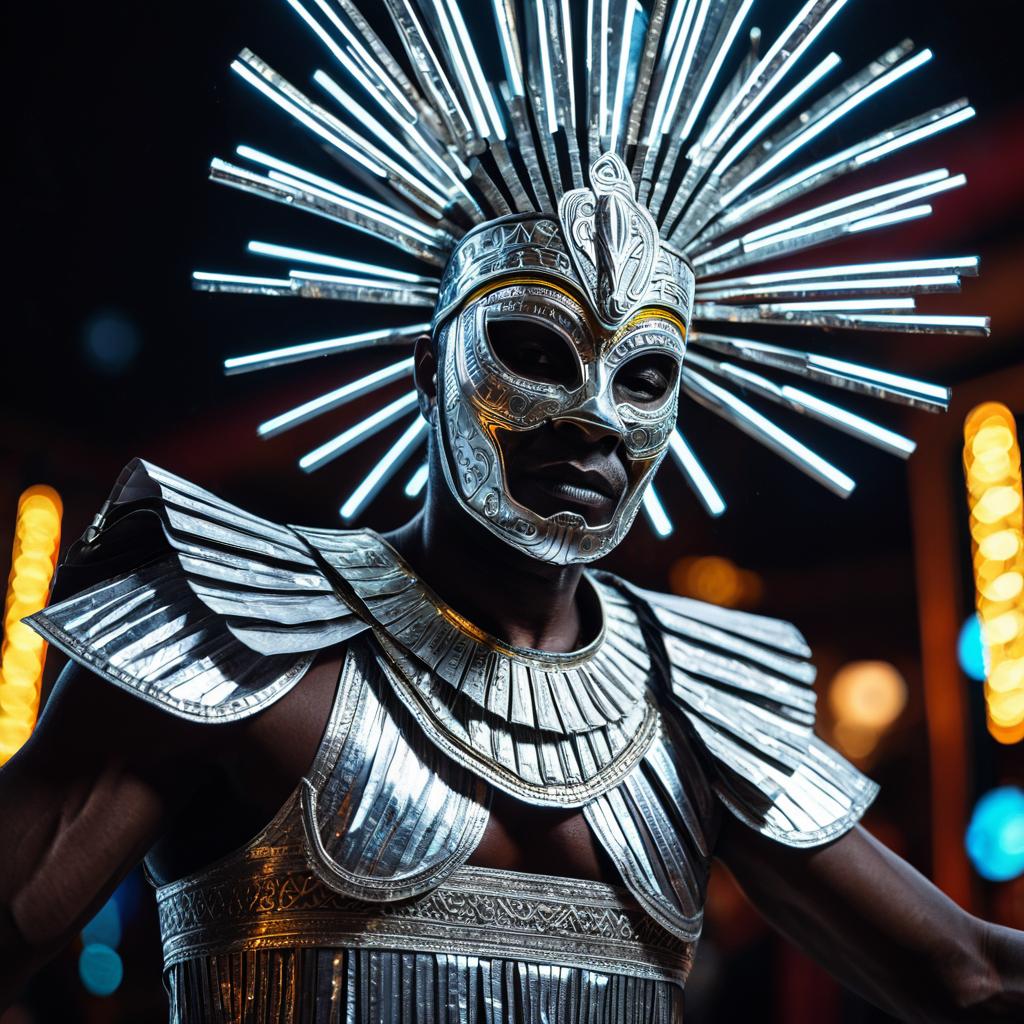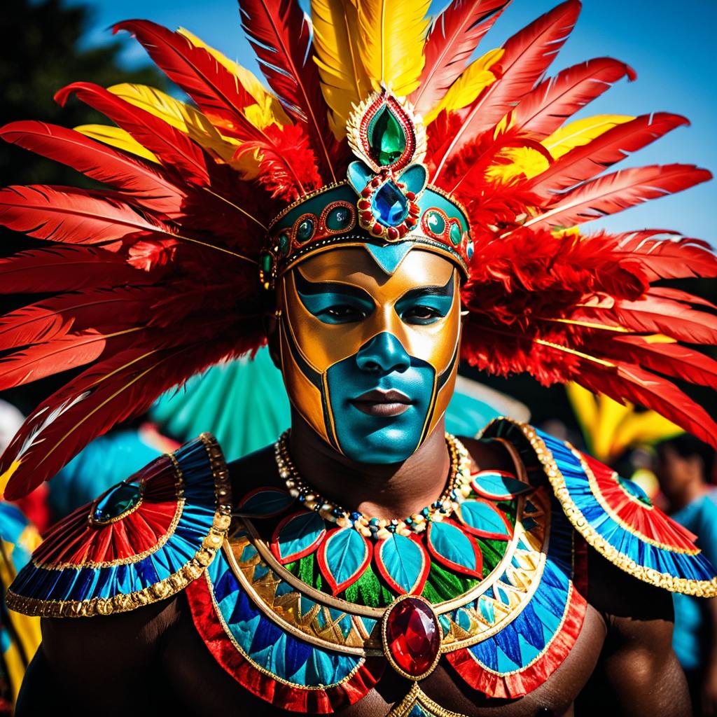 Male carnival costume, photorealistic, male carnival dancer, close-up, vibrant, detailed, ornate headdress with colorful feathers (red, blue, yellow, green), gold mask with black detailing, traditional gold chest armor with red and blue patterns, red and blue necklace with teal gem, muscular build, medium skin tone, serious expression, outdoor setting, blurred background with other carnival attendees, bright daylight, festive, cultural attire, colorful, intricate design, high contrast, strong shadows, symmetrical composition, traditional, celebration