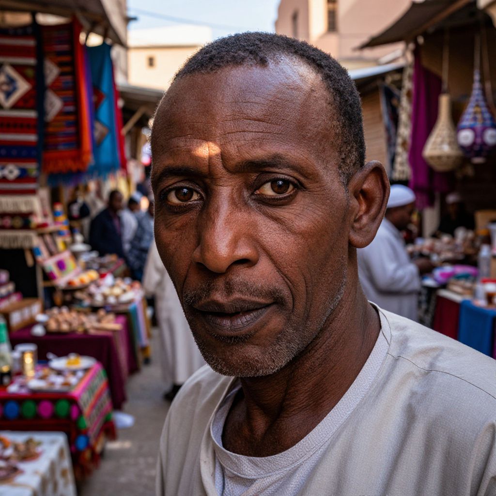 Imagine a portrait photograph capturing the enigmatic gaze of an African man with deep brown eyes, set against the backdrop of Marrakech's bustling marketplace. The subject's face, weathered by a life well-lived, is illuminated by warm sunlight filtering through vibrant tapestries and the colorful stalls of the souk, casting dramatic shadows that accentuate his rugged features. Framed within the chaotic symphony of sights, sounds, and aromas unique to Moroccan markets, this striking image juxtaposes the grand spectacle of the surroundings with the intimate, contemplative expression on the man's face, evoking a range of emotions in the viewer, from curious intrigue to respectful contemplation.