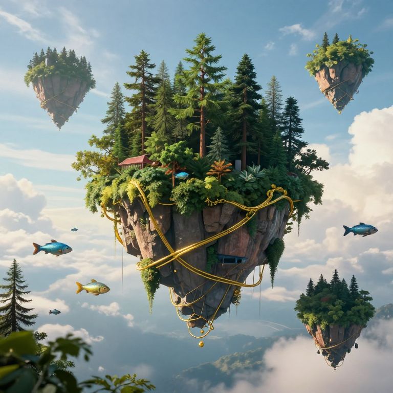 Floating islands tethered by golden vines drift across a sky painted with real forests, while air-breathing fish migrate between them.