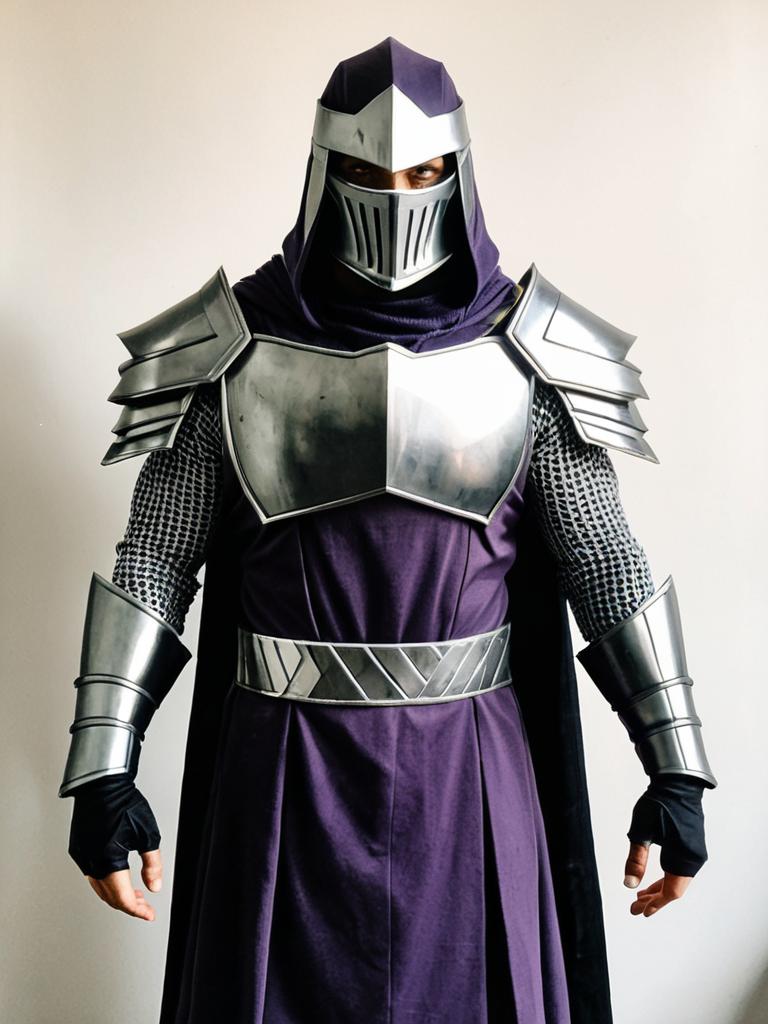 Man cosplay. Wearing The Shredder (2003) costume. Realistic photo. Dressed as The Shredder (2003) --sref 1400