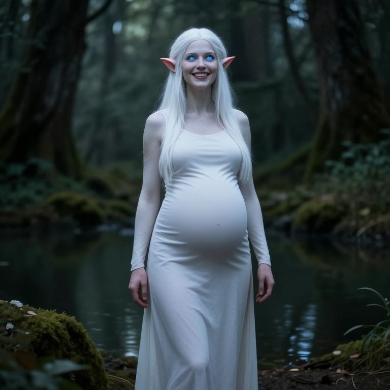 Photograph of a pregnant, fair-skinned woman with long white hair and pointed elf ears, standing in a dark, misty forest beside a reflective stream. She wears a form-fitting, sleeveless white dress that accentuates her prominent belly. Her blue eyes and bright smile contrast with the shadowy background of tall trees and moss-covered rocks. The lighting is dim, creating a mystical, ethereal atmosphere. The forest floor is damp and textured with moss and small plants. The overall composition evokes a fantasy or fairy tale setting.