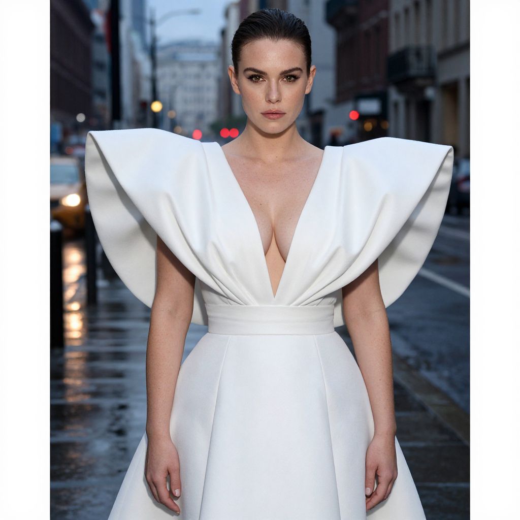 Photograph of a young woman with fair skin and dark, slicked-back hair, standing on a wet city street at dusk. She wears a white, high-fashion dress with exaggerated, wide, winged shoulders and a deep V-neckline that reveals part of her cleavage. The dress has a cinched waist and a full skirt. The background is blurred, showcasing dimly lit buildings and streetlights, with reflections of light on the wet pavement. The overall style is modern and avant-garde, with a focus on bold fashion against an urban, nighttime setting.