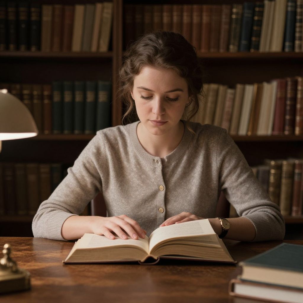 Photograph of a young woman with fair skin and dark brown, wavy hair tied back, sitting at a wooden desk in a dimly lit library. She wears a gray, buttoned cardigan and focuses intently on an open book in front of her. The background features dark wooden bookshelves filled with various books. A white, dome-shaped lamp on the left casts soft light on the desk. A closed book is partially visible on the right. The atmosphere is quiet and scholarly, with warm, muted colors.