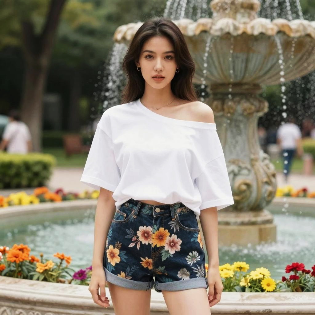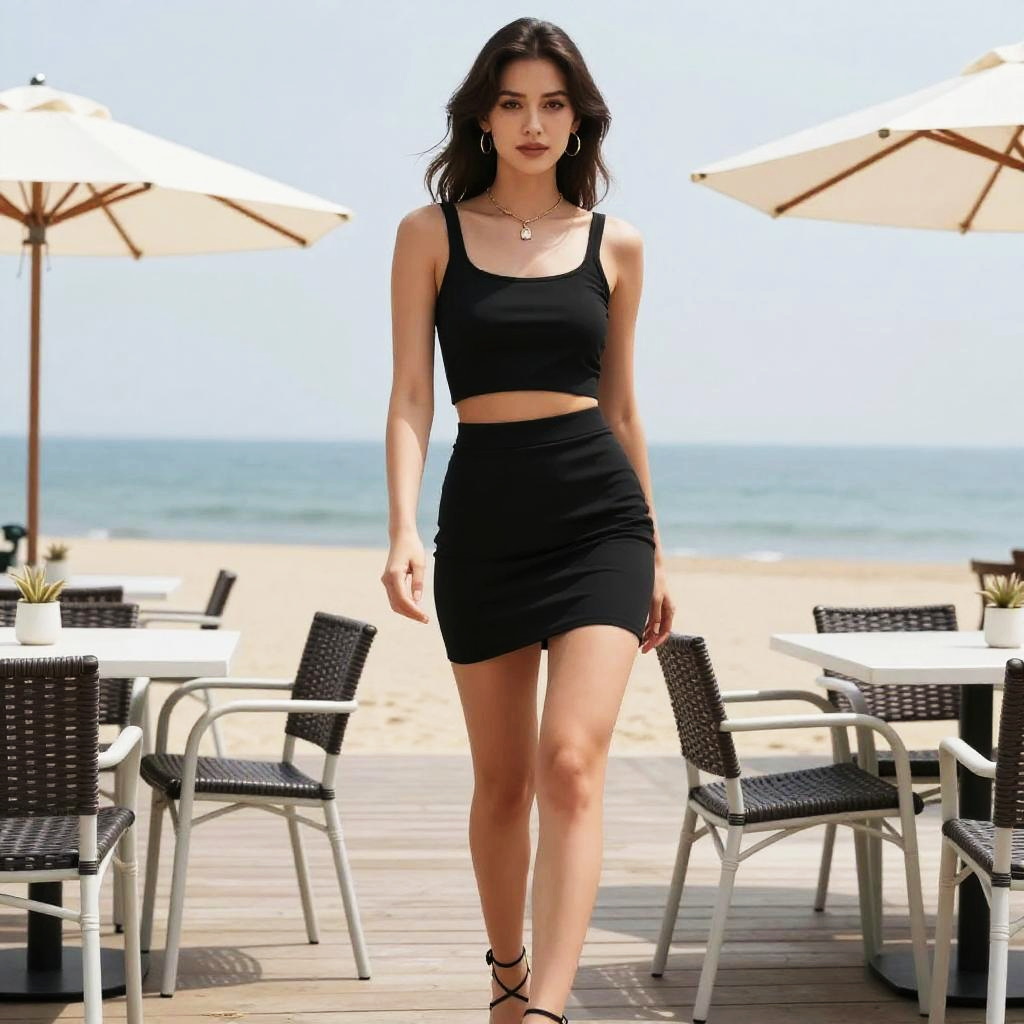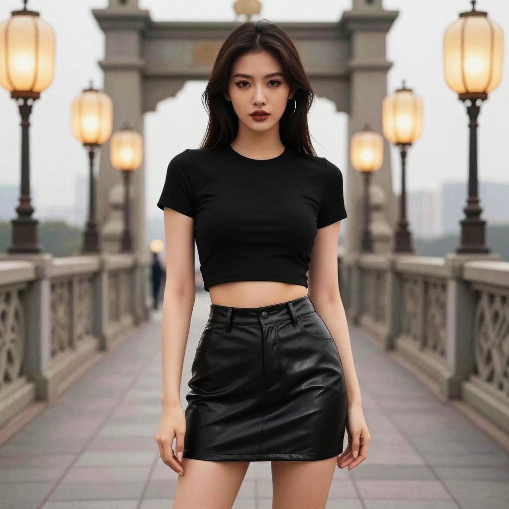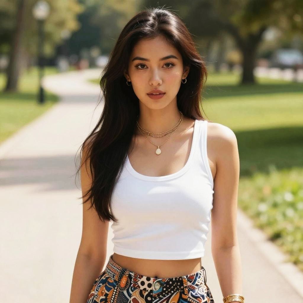 A willowy woman in a casual chic outfit featuring a white cropped tank top and high-rise black skinny leggings stands confidently at an urban plaza fountain, embodying the vibrant visual style of Yen Press. She completes her look with studded black pointed-toe pumps, exuding a modern elegance amidst the lively atmosphere. Sexy. Pretty face and beutiful eyes