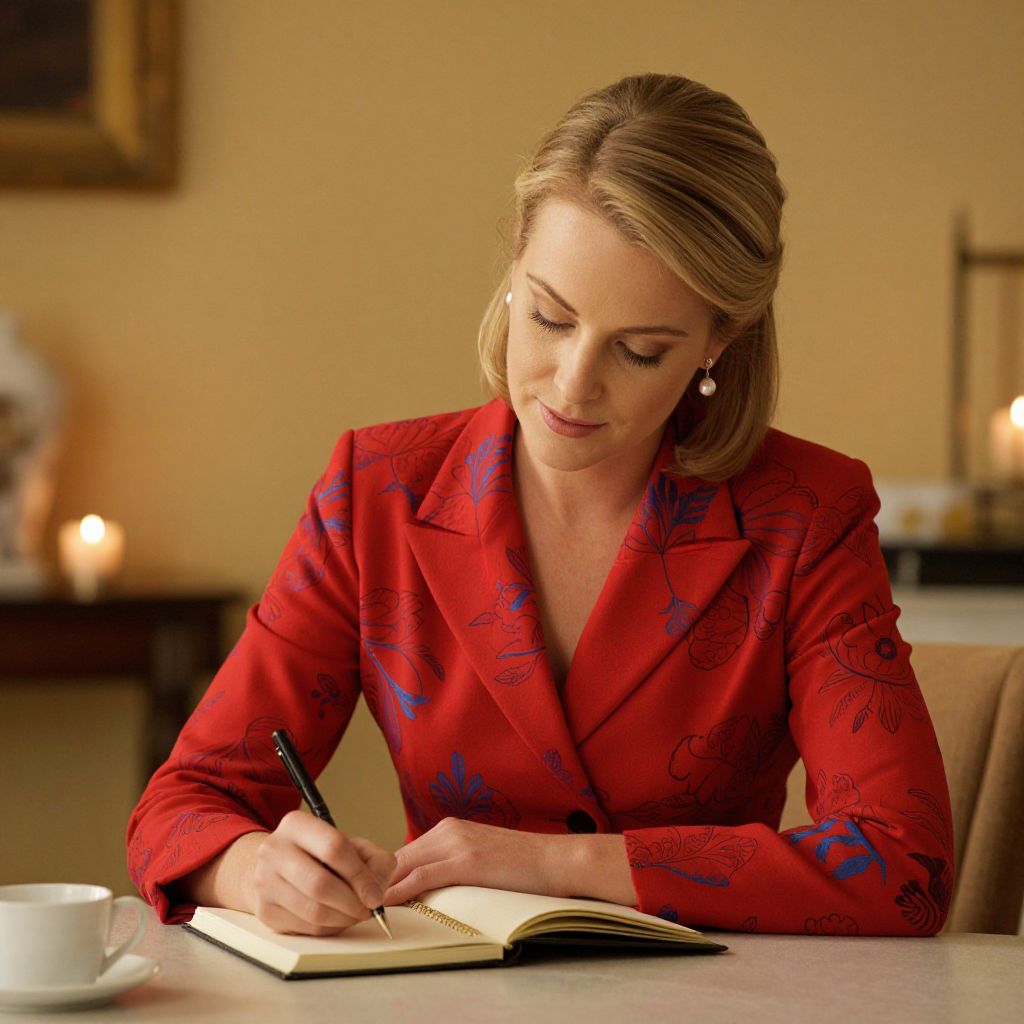 Elegant woman seated at a warmly lit table, writing in a notebook while wearing a vibrant red blazer with blue floral patterns, her blonde hair styled neatly and accessorized with pearl earrings, surrounded by soft ambient lighting and cozy decor.