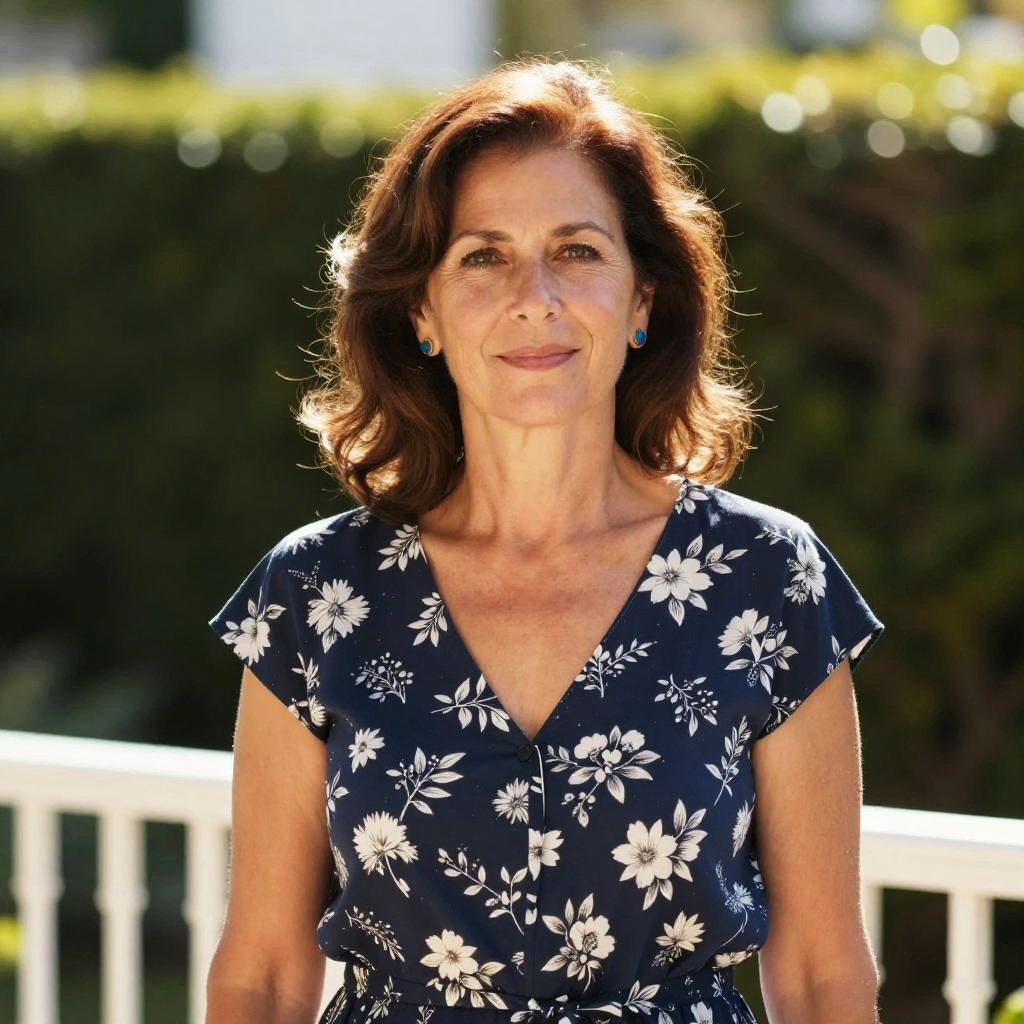 Fine-art editorial photograph, photoreal SDXL: serene middle-aged Latina woman with warm caramel skin and long straight dark hair reclining in a bright sunroom with Windows framing garden flowers and wicker furniture, styled in a pastel pink sheath dress with delicate gold jewelry and nude ballet flats. No nudity. Right hand holds an unlit cigarette, gaze calm and assured. Subtle film grain, shallow depth of field, warm ambient glow, high detail, intimate yet tasteful.