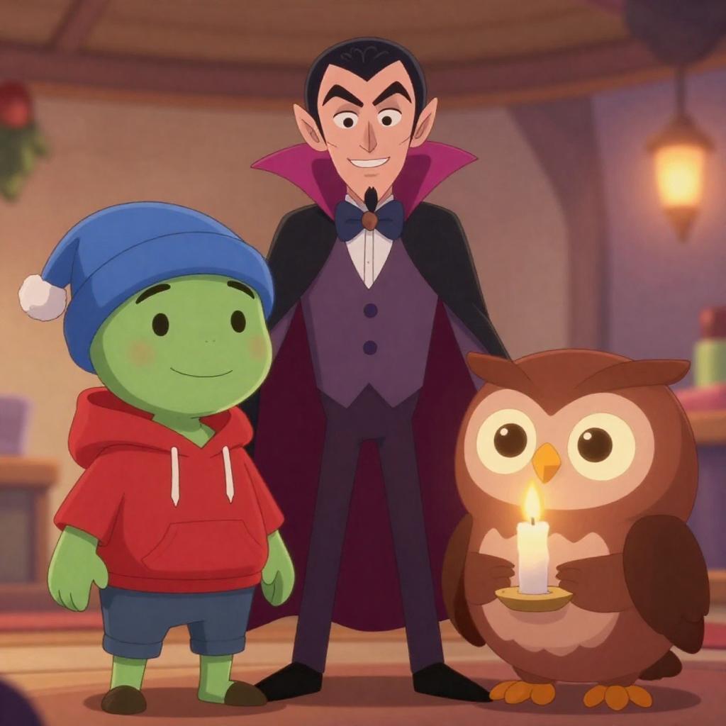 Digital illustration of a nighttime scene with a large, orange, pumpkin-headed character with glowing eyes and a carved smile standing on the right. A small, gray, humanoid figure with white hair kneels to the left. A dark, ornate fountain and tall, green trees are in the background. Bright beams of light shoot upwards from the right.