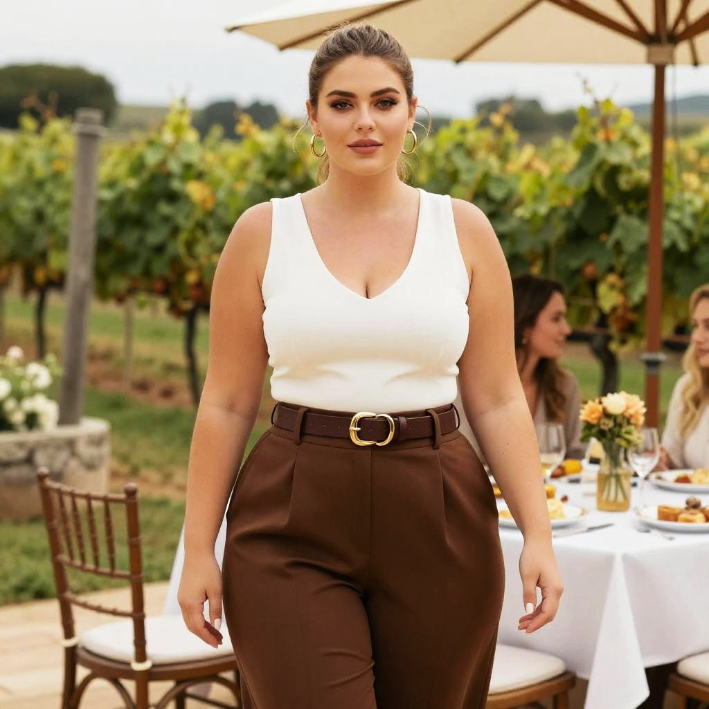 A Plus-size woman in a contemporary chic outfit featuring a white sleeveless top with a plunging neckline and high-waisted chocolate brown wide-leg trousers, accessorized with a gold-toned buckle belt and hoop earrings, stands elegantly at a Breakfast Gathering at a Vineyard Terrace, surrounded by lush greenery and rustic charm, showcasing a sleek pulled-back hairstyle. Sexy. Pretty face and beutiful eyes