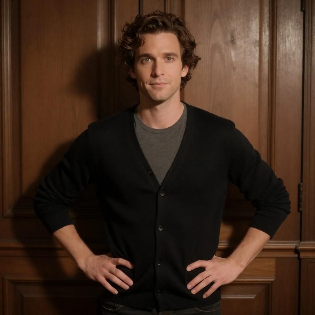Photograph of a man with wavy brown hair, wearing a black cardigan over a gray shirt, standing with hands on hips. Warm, dim lighting casts shadows, highlighting his confident expression. Wooden paneled background adds a rustic feel.