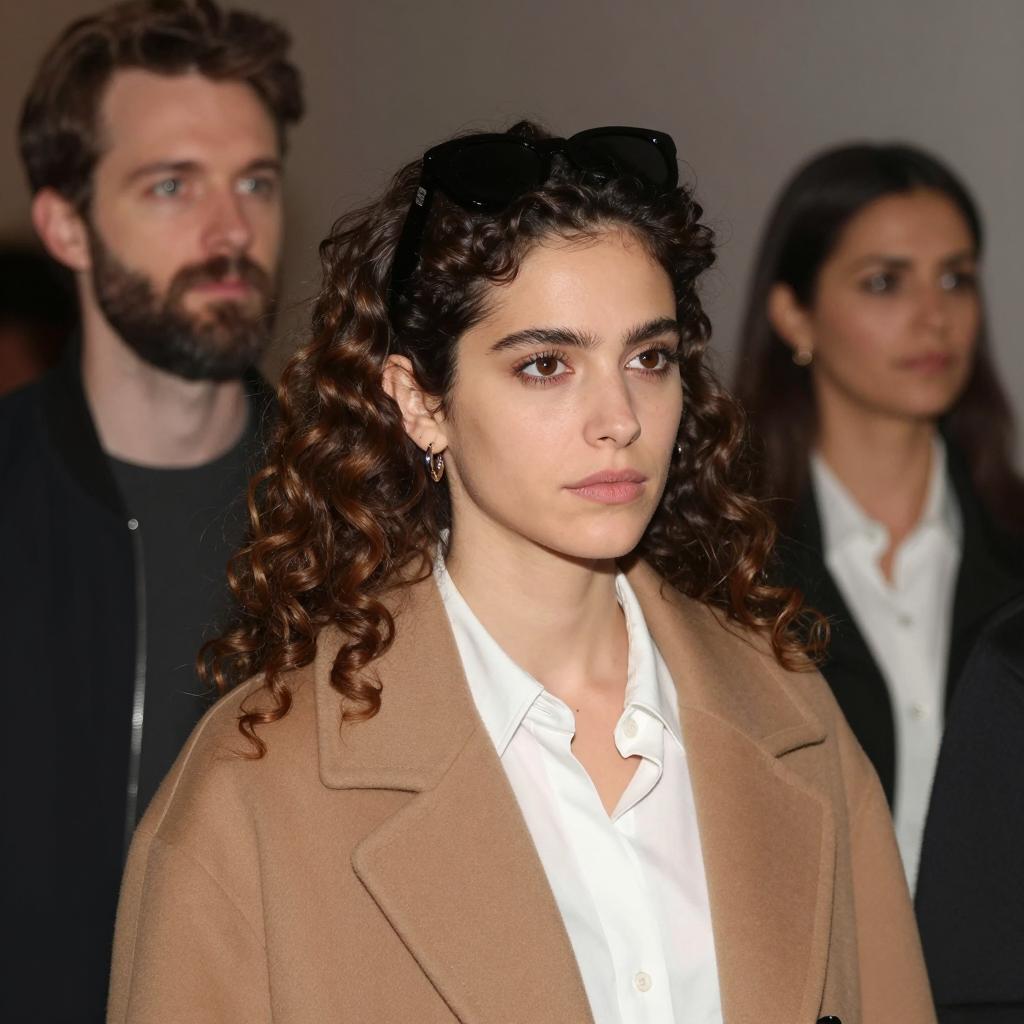 Photograph of three people. Foreground: woman with curly brown hair, black sunglasses on head, tan coat, white shirt, intense gaze. Background: man with dark beard, mustache, brown hair, slightly blurred, looking to the side. Background woman with dark hair, white shirt, blurred face. Dimly lit, indoor setting.