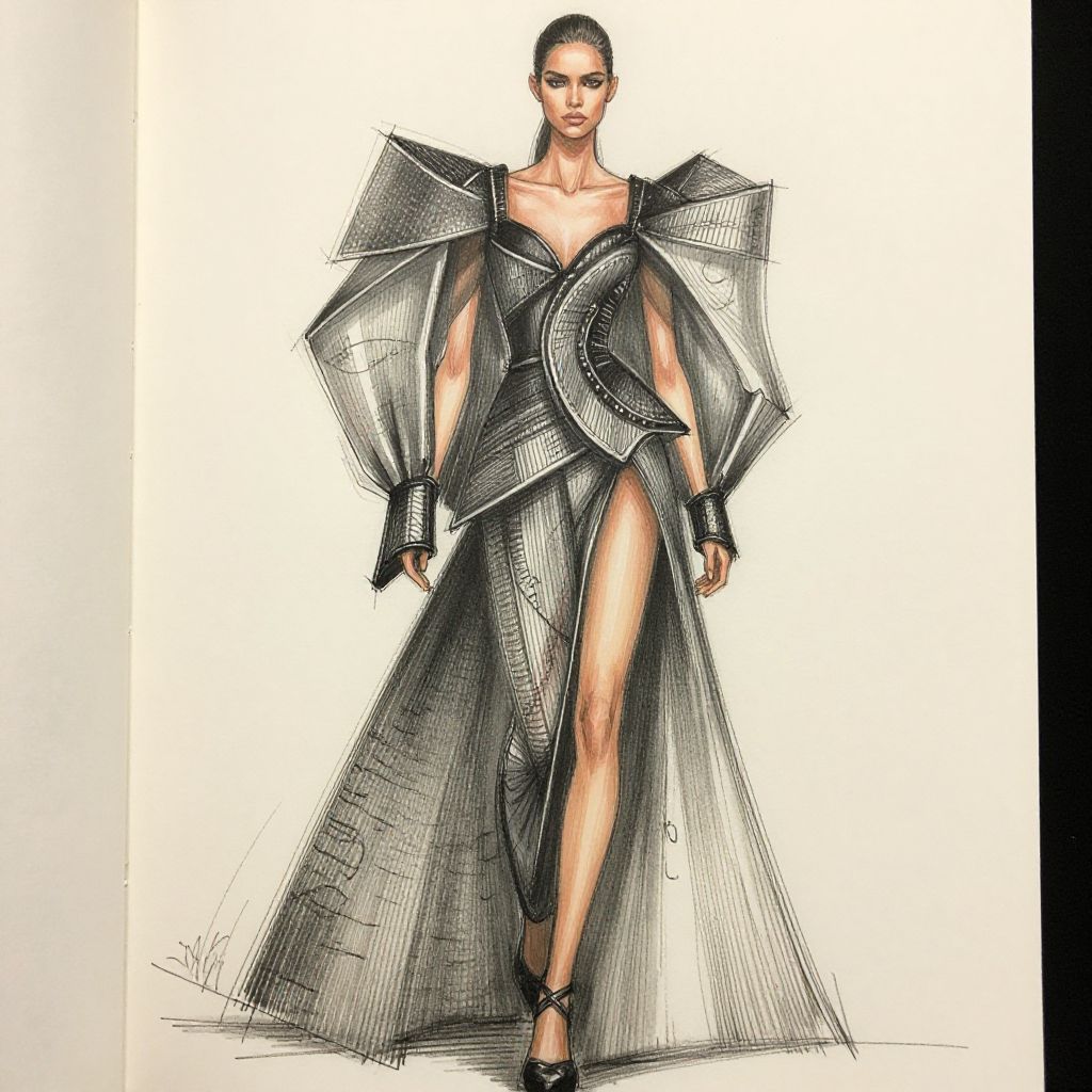 Fashion model sketch showcasing avant-garde clothing with exaggerated proportions, bold lines and intricate patterns, artful blend of charcoal and ink, sketchbook style with annotations, spotlight on texture variation and striking runway posture.