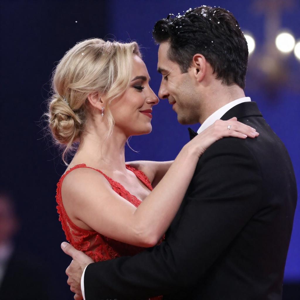 Photograph of a woman with long, straight, blonde hair in a black, patterned top, looking up at a bearded man with a bald head and silver streaks, holding a microphone. The background is a blurred, glowing, blue-lit cavern. The man's face is illuminated by the microphone light.