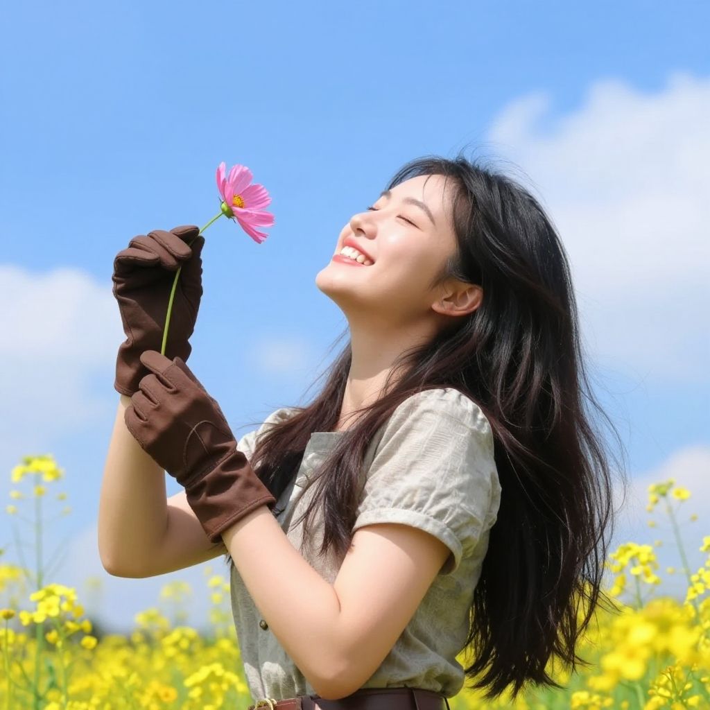 This digital anime-style artwork depicts a young Asian woman with long, wavy brown hair adorned with white and pink flowers. She wears a blue dress with white puffed sleeves and brown straps, and white gloves featuring floral patterns. She holds a bouquet of vibrant pink, red, and yellow flowers close to her chest. The background showcases a bright, sunny field filled with yellow and pink flowers, under a clear blue sky with white clouds. Her large, expressive eyes and soft smile convey a sense of joy and innocence. The image is highly detailed, with a focus on vibrant colors and soft textures.