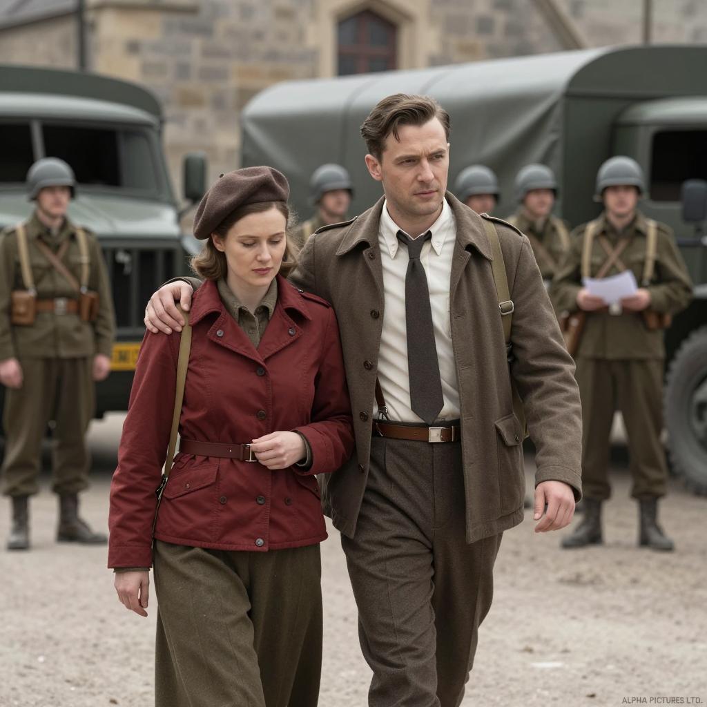 A winter scene. Close-up of a serious man and woman with fur hats, right side. Background shows a line of soldiers in winter gear with horses, orange and white sky. Man has brown hair, mustache, white coat. Woman has blonde hair, pale skin, white coat. Soldiers carry flags and rifles. Horses in the middle ground. Trees and fog in the background.