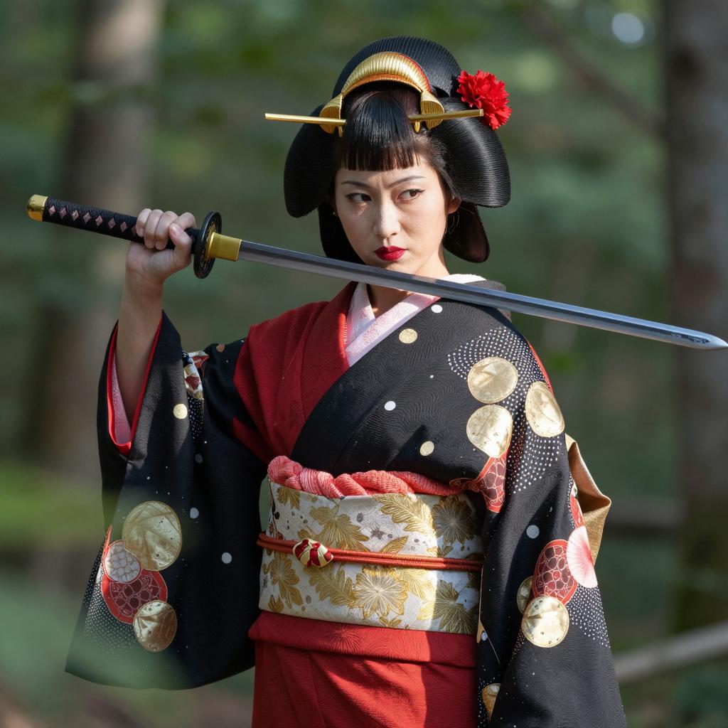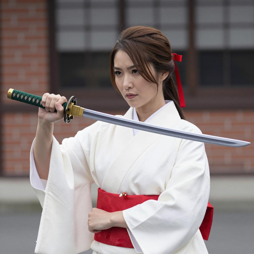Asian woman wearing white fox mask with red markings, white kimono, holding a sword, blurred in mid-action, bloodstained cloth in foreground, purple tassels on mask, ceiling background, intense upward gaze, right arm raised, sword angled diagonally, dynamic movement.
