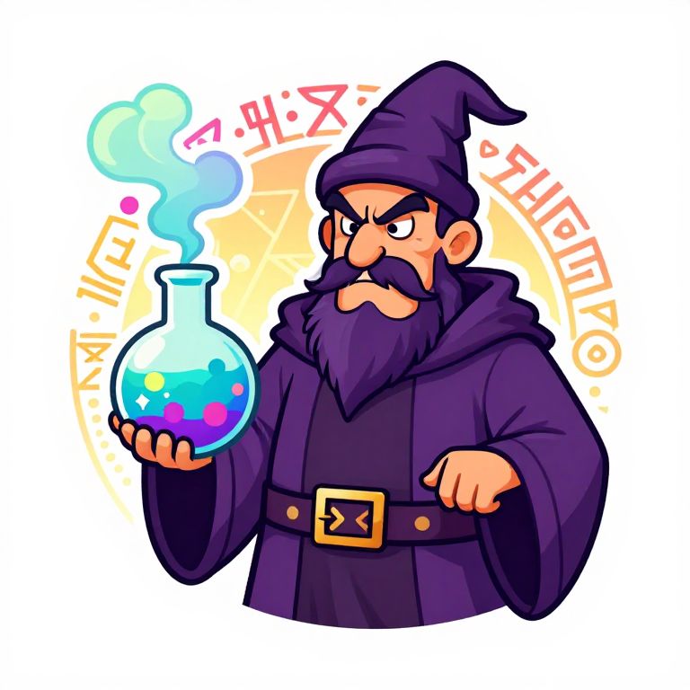 Funny fantasy team logo illustrating a grumpy wizard holding a bubbling magic potion that emits colorful smoke, exaggerated cartoon style, vibrant magical runes in the background, humorous expression capturing lighthearted fantasy mood, bold and clean design.
