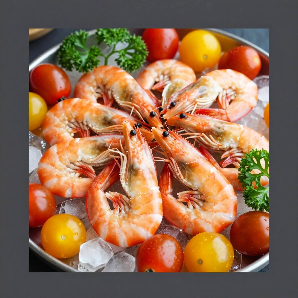 This vibrant photograph showcases a colorful seafood platter overflowing with fresh, steamed shrimp. The shrimp, with their orange and white shells, are piled on a bed of ice and surrounded by bright red and yellow cherry tomatoes. Fresh green parsley adds a touch of freshness to the scene. The image is framed with dark gray borders, enhancing the vivid colors of the food.