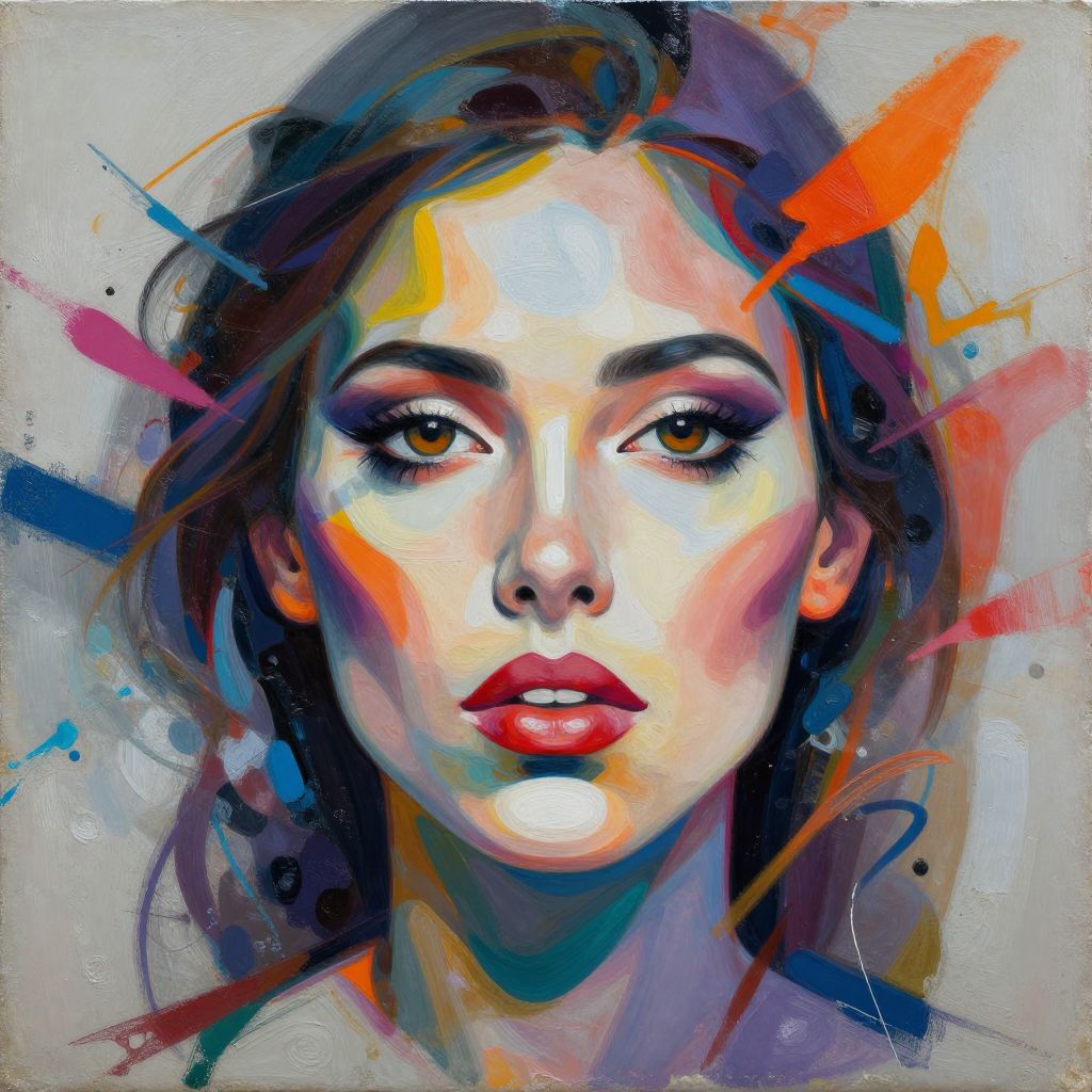 A modern art painting featuring a woman's face with vibrant, abstract splashes of color.