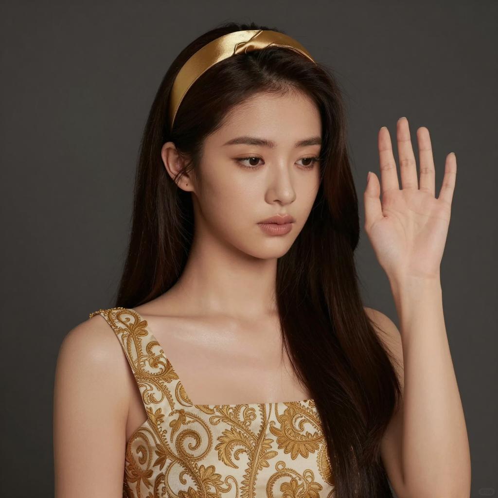 Photograph of a young woman with long dark brown hair, wearing a gold headband and a sleeveless, gold-patterned dress. She raises her left hand, gazing slightly downward with a neutral expression. Dark background, soft lighting.