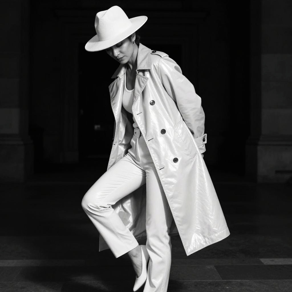 A black-and-white photograph of a person standing in a dynamic pose. They're wearing a long, shiny coat and matching pants, with a wide-brimmed hat tilted to one side. They're leaning slightly to one side, with one leg raised and bent at the knee. The background is dark, making the person's bright attire stand out prominently. The image has a high-contrast, almost surreal quality.