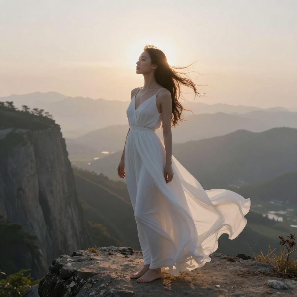 Ethereal beauty woman in flowing white dress, standing on cliff edge at dawn, radiant light halo around her, wind-blown hair, mystical landscape with distant mountains and fog