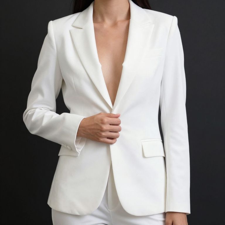 Photograph of a person wearing a crisp, white, tailored blazer with a deep V-neck, exposing a hint of the chest. The blazer has a single button, which is being held by the left hand. The background is solid black, making the white blazer stand out prominently. The person's face is not visible, and only the torso and part of the left arm are shown. The texture of the blazer is smooth and slightly shiny, indicating a high-quality fabric. The overall style is modern and professional.
