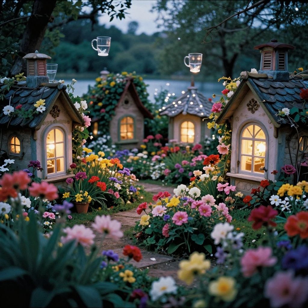 A whimsical garden where blossoms bloom in intricate clusters, offering a cozy retreat to the infinite. The scene is lush and colorful with flowers blooming around ornate cottages at twilight ornaments floating above glass mugs inviting contemplation into one of Nature's natural wonders under lighted windows overlooking sparkling waters below.., 2000s vintage RAW photo, photorealistic, film grain, candid camera, color graded cinematic, eye catchlights, atmospheric lighting, imperfections, natural, shallow dof, High level of detail to create a photographic-like image, focusing on lighting, realistic textures, hyperdetailed.