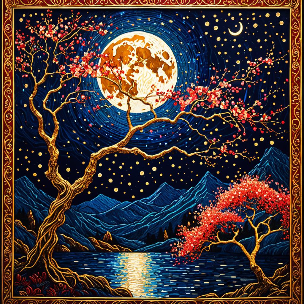 A digitally illustrated towering ancient oak tree illuminated by radiant lanterns hanging from its branches and two ornate lanterns on the water's edge. The scene features a vivid night sky with a large full moon and a starry blue background enhanced with golden flakes, reflecting on the calm water surface. The style is inspired by fantasy and pop art, featuring rich neon colors and intricate details.