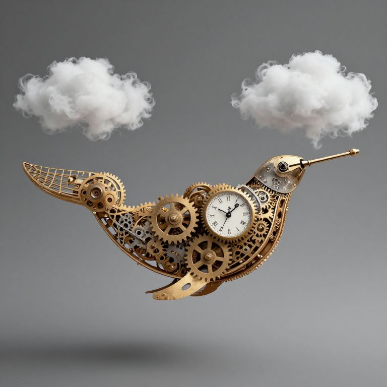 A clockwork whale navigates the sky, its body made of interlocking gears and time itself, exhaling clouds of suspended seconds.