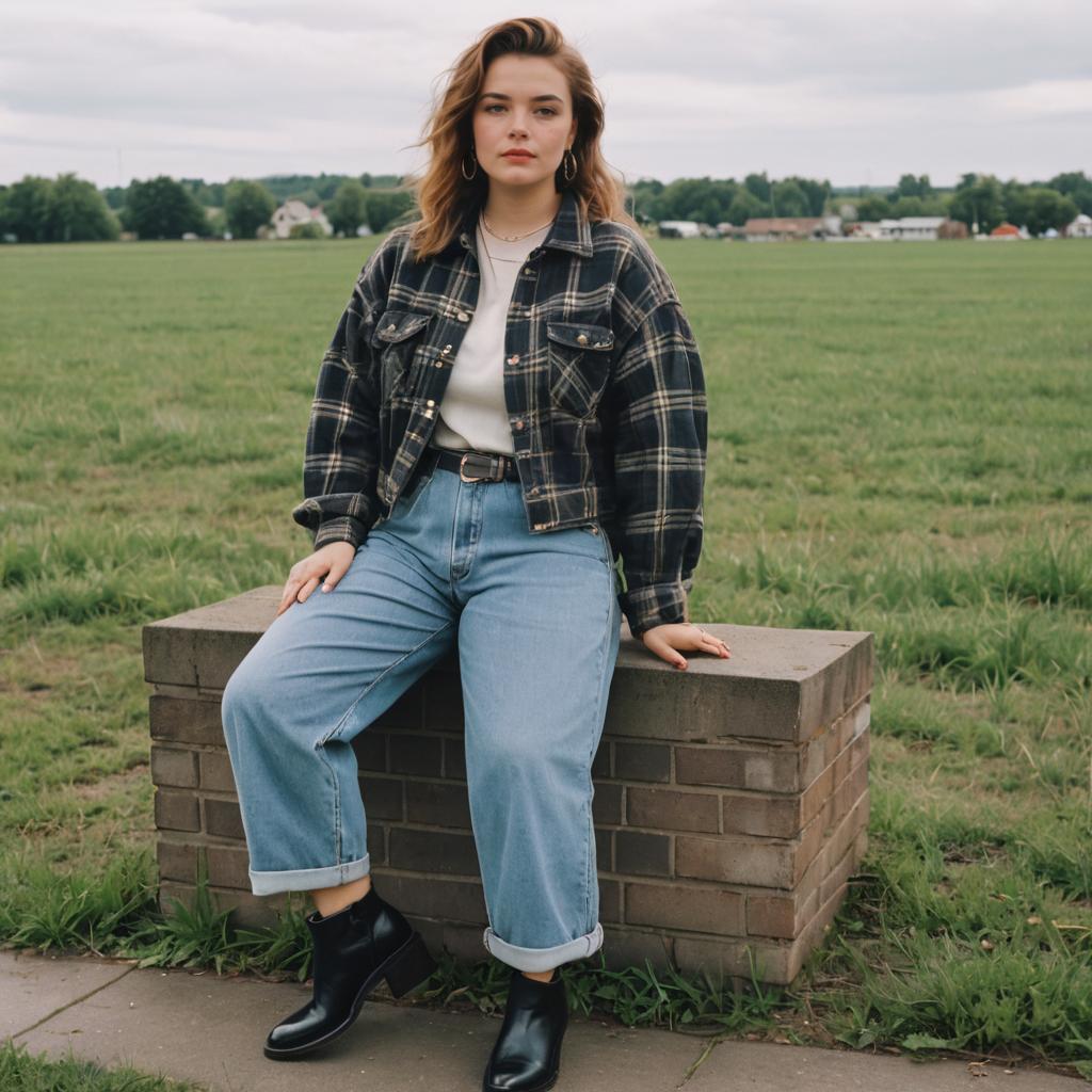 Photo of a Curvy woman, Braided, 90s outfit, baggy cropped jeans in Bistre, oversized flannel shirt in Leather, graphic t-shirt, denim jacket, leather chunky heels, grunge style, plaid patterns, muted colors, casual, vintage, retro, 1990s fashion, Grass Field, soft pastels