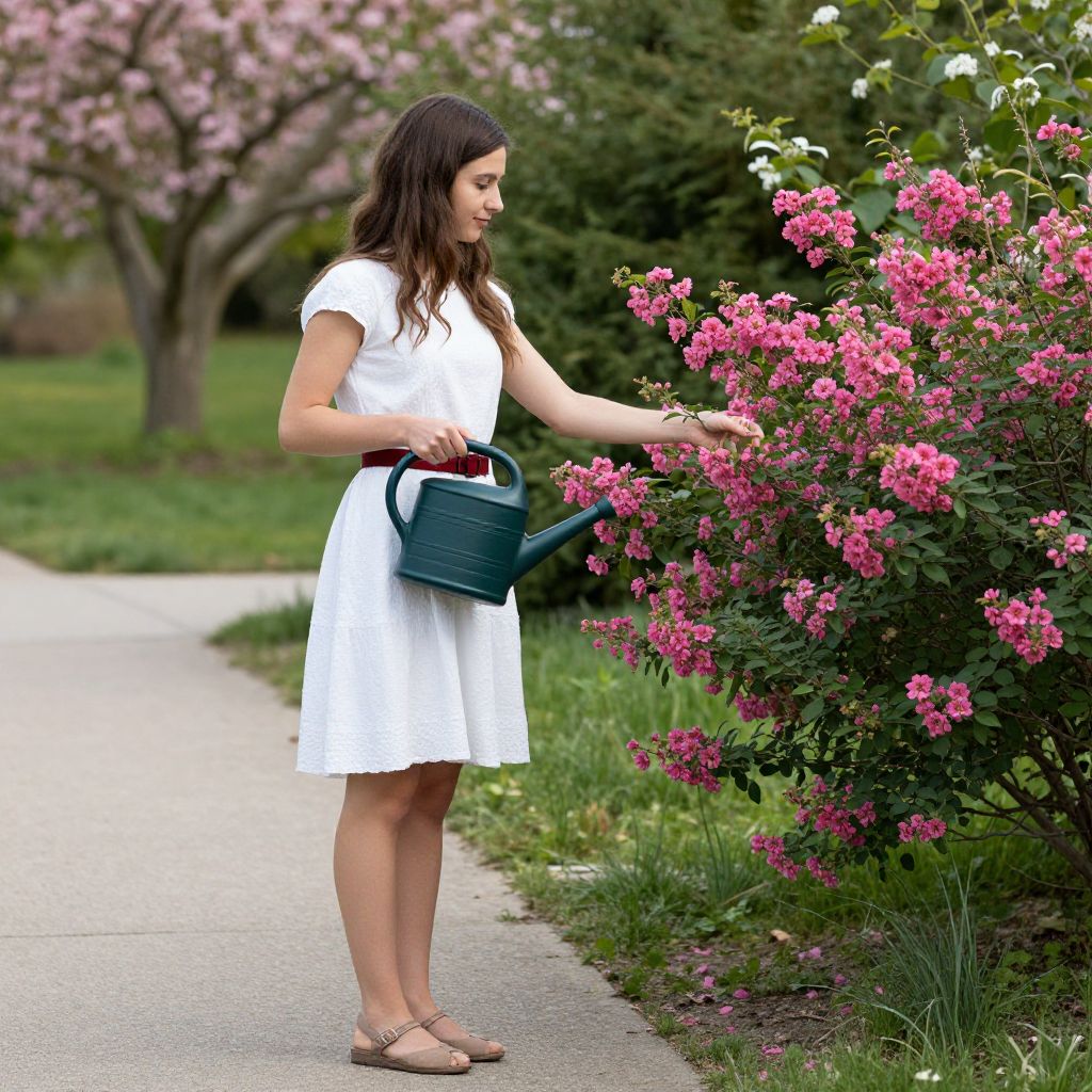 Young woman in a white dress and red belt stands on a paved path, holding a dark green watering can as she tends to a flowering shrub adorned with vibrant pink blossoms, set against a serene garden backdrop featuring lush greenery and a blooming tree.