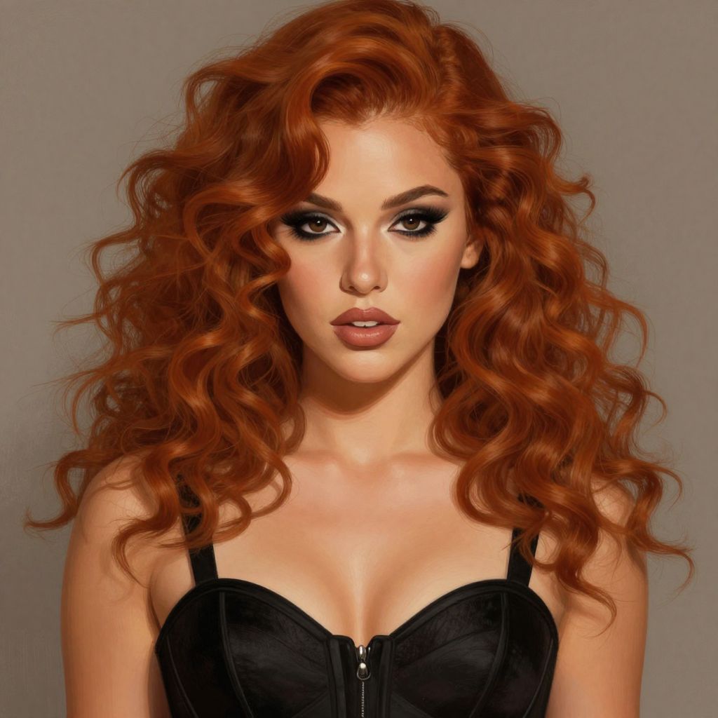 Photograph of a young woman with voluminous, curly red hair, wearing a black, strapless corset, against a plain gray background.
