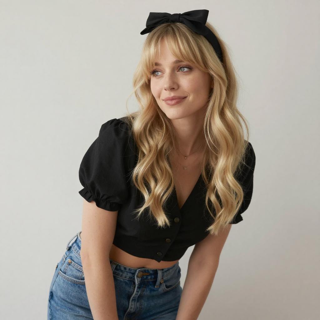 Photograph of a blonde woman with wavy hair, wearing a red headband and black turtleneck, sitting on a black chair with an orange strap. She rests her chin on her hand, looking thoughtfully to the side. A bottle of soda is on a white table in the bright background.