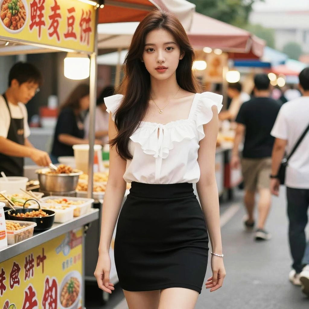A petite woman in a Kodansha comics style, wearing a white ruffle top and a fitted black mini skirt, stands at a street food market stall, surrounded by vibrant food carts and lively patrons, with a simple silver bracelet adorning her wrist. Sexy. Pretty face and beutiful eyes