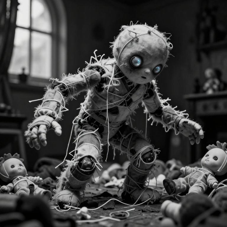 The image depicts a monstrous creature crafted from the remnants of doll parts, assembled in a haphazard yet eerily coherent manner. Its body is a patchwork of various doll components, including fabric, thread, and other miscellaneous materials, all tied together with rough, makeshift bindings. The creature's eyes, glowing with an eerie blue light, are large and round, giving it a haunting and unsettling appearance. Its movements are jerky and unpredictable, as though it is barely holding itself together, with its limbs and appendages appearing to be in constant motion. The background is dimly lit, with a single window casting a faint light that accentuates the creature's macabre essence. The overall composition is stark and black and white, capturing the macabre and unsettling nature of the scene. The creature's position is central, with other doll parts scattered around it, creating a sense of chaos and disarray. The interplay of textures, from the rough fabric to the smooth thread, adds to the visual richness of the image, while the spatial relationships between the various elements create a sense of depth and complexity.