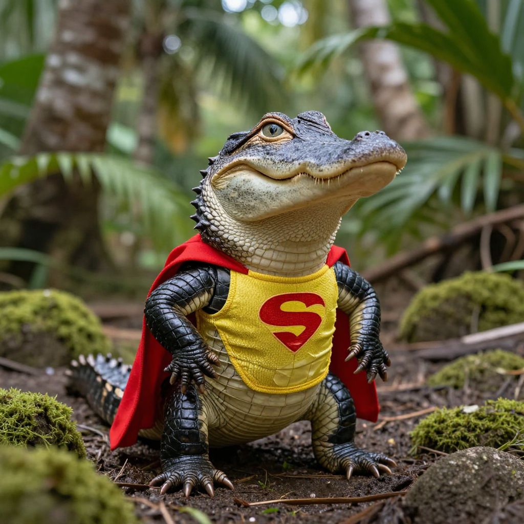 Photograph of a detailed, realistic, small alligator wearing a yellow Superman costume with a red cape and red "S" emblem, standing on moss-covered forest ground. The alligator's scales are black and gray, and its expression is determined. Background features blurred green foliage, palm leaves, and tree trunks, creating a lush jungle atmosphere. The lighting is natural, highlighting the alligator's costume and the texture of the moss and forest floor. The overall scene is vibrant and whimsical.