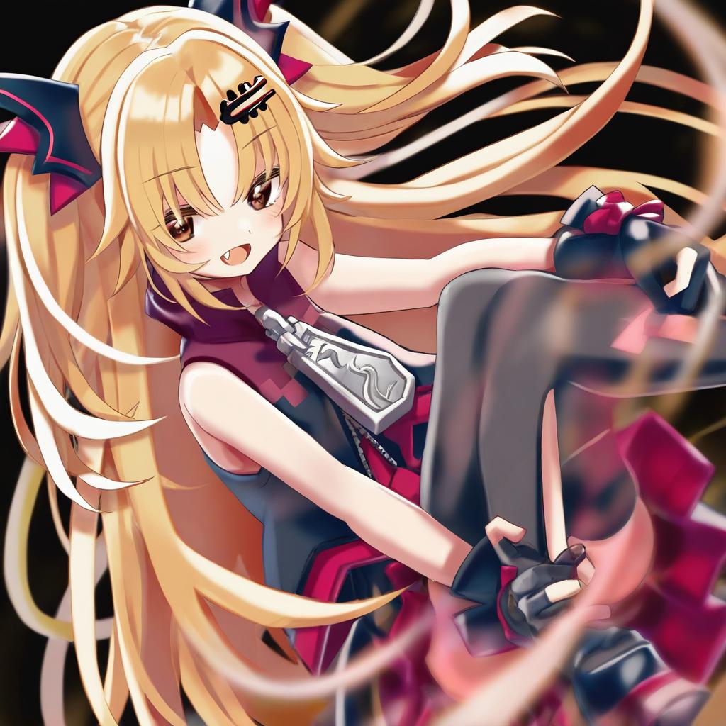 Albacore (azur lane), azur lane, 1girl, fang, hair between eyes, green eyes, star in eye, blonde hair, very long hair, long hair, ahoge, small breasts, navel, collarbone, headphones, bare shoulders, wristband, by artist wada kazu, leet
