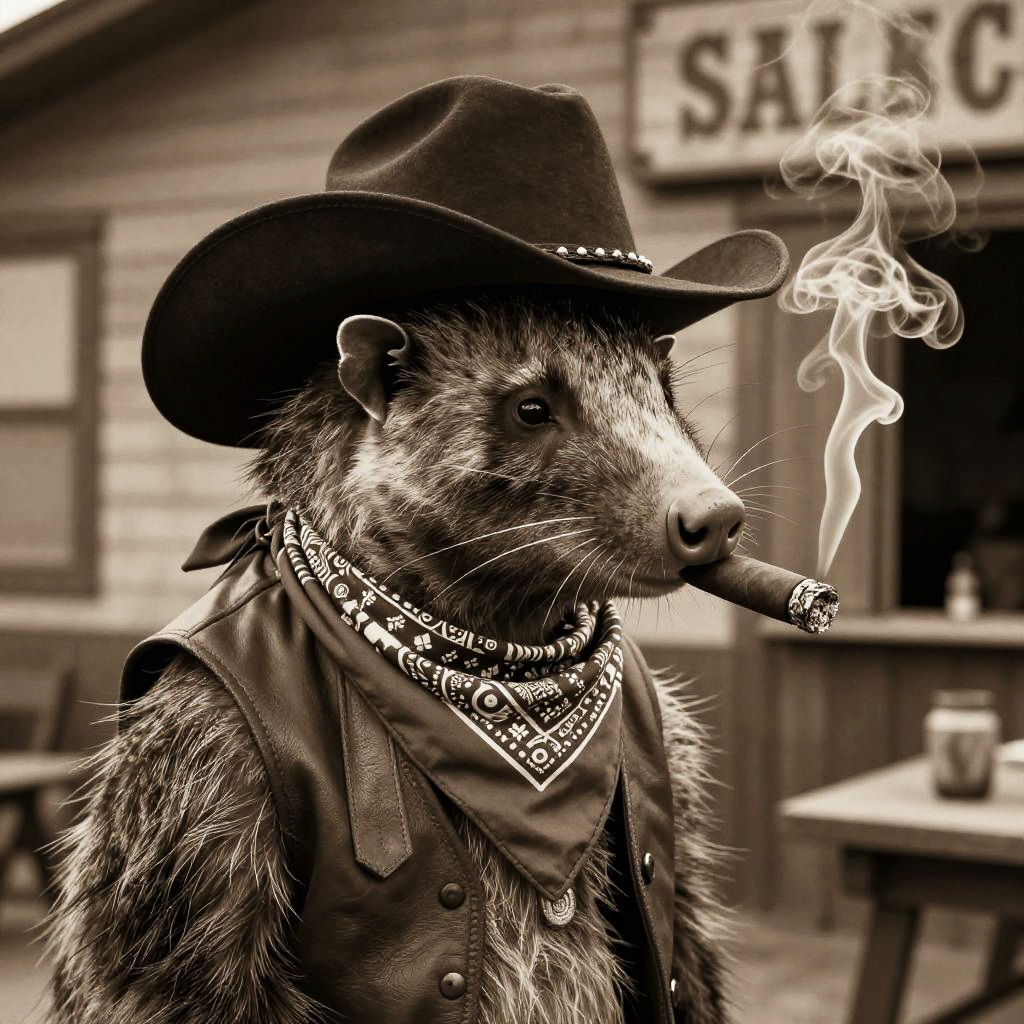 Raccoon in cowboy hat sitting on a wooden fence at sunset, detailed fur textures, rustic wild west background, soft warm lighting, cinematic style, high resolution, natural environment, cowboy hat slightly tilted