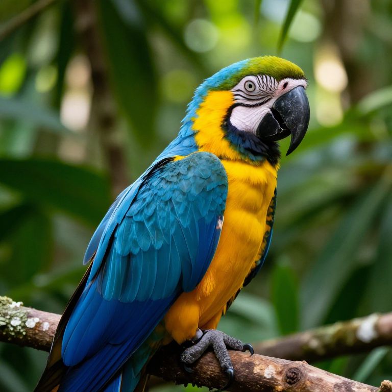 A close-up portrait of a vibrant blue and yellow macaw perched on a branch in a lush tropical rainforest, with dappled sunlight filtering through the canopy, capturing the bird's iridescent feathers in sharp detail.