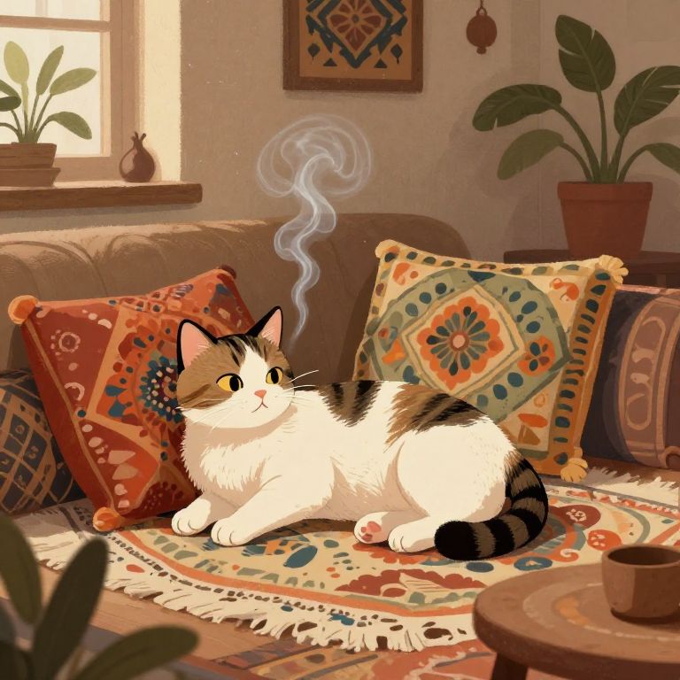 Illustration of a cat with a blunt lounging in a bohemian living room, surrounded by colorful cushions and incense smoke swirling gently, artistic and whimsical vibe, rich textures and warm earthy tones, detailed and cozy interior setting.