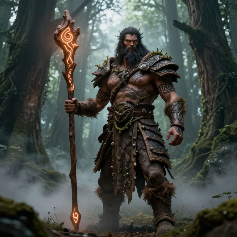 Digital fantasy artwork of a muscular, bearded barbarian with dark fur clothing, holding a glowing, ornate staff, in a misty forest.