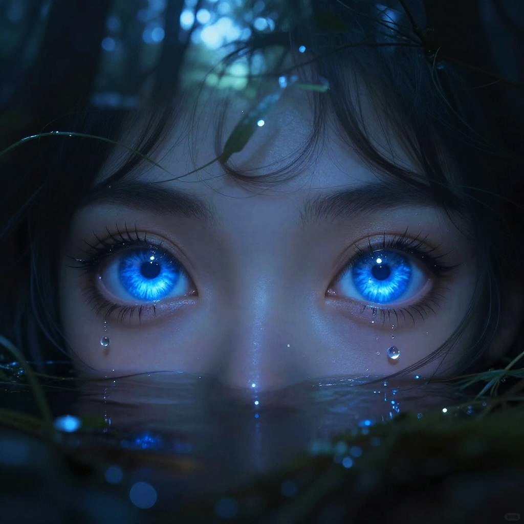 Mystical ocean blue eyes glowing in a dark forest, ethereal light illuminating striking blue irises, water droplets on eyelashes, fantasy style with magical watery reflections