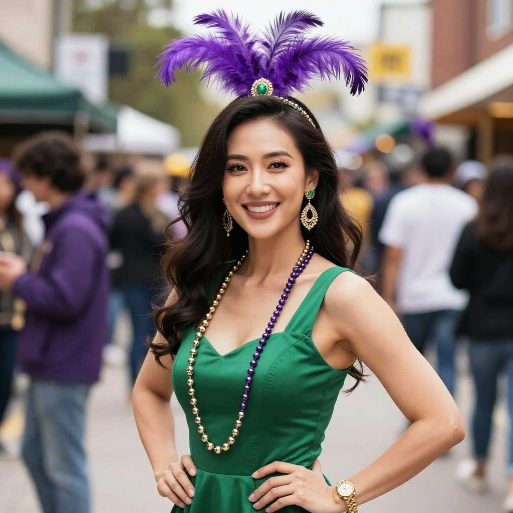 A young woman wearing a vibrant green dress and a headpiece adorned with large purple feathers, accessorized with gold and purple bead necklaces, and intricate gold earrings. She is smiling and posing confidently outdoors at a crowded event, likely a Mardi Gras celebration.