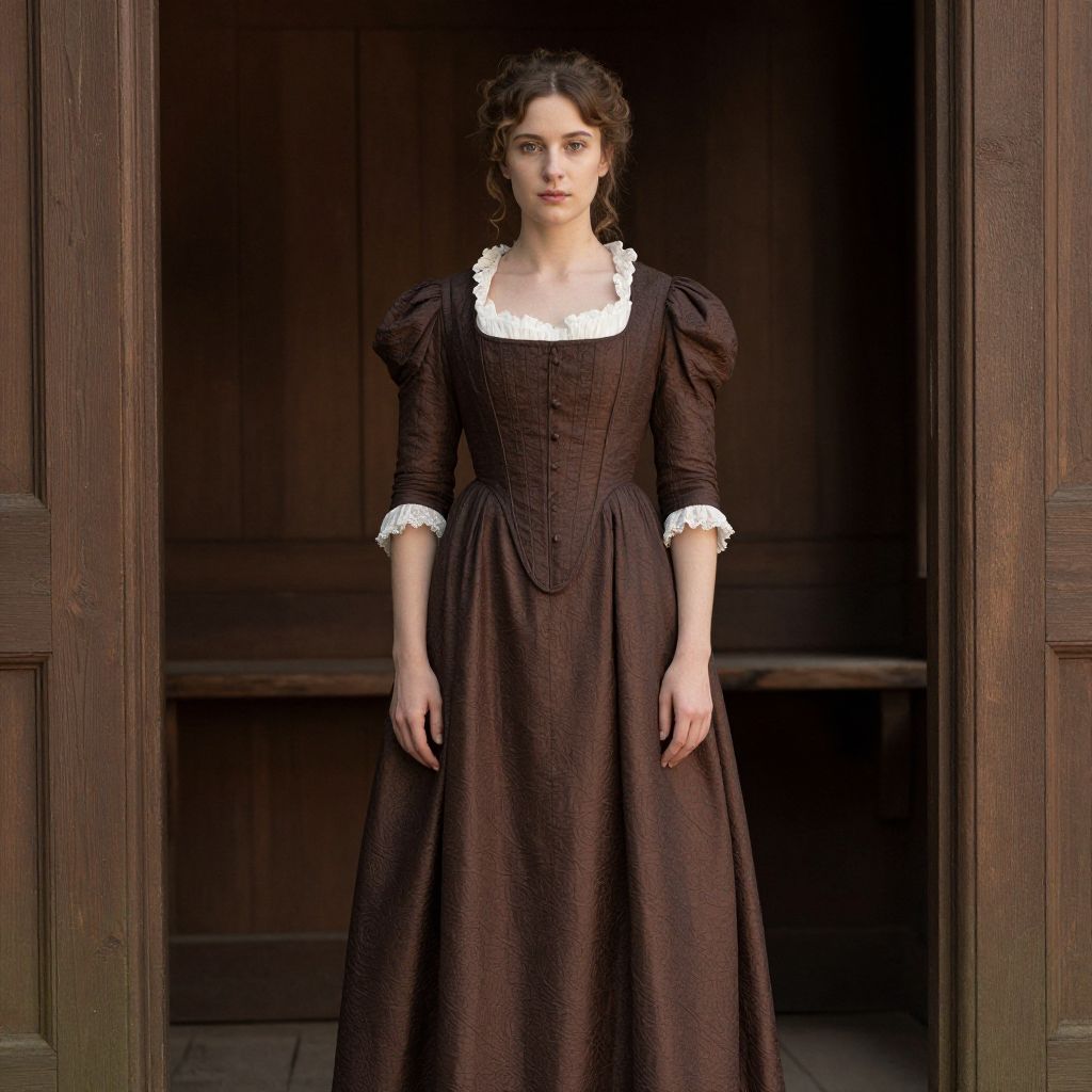 Romantic Era Costume, woman in a brown dress standing in front of a wooden structure