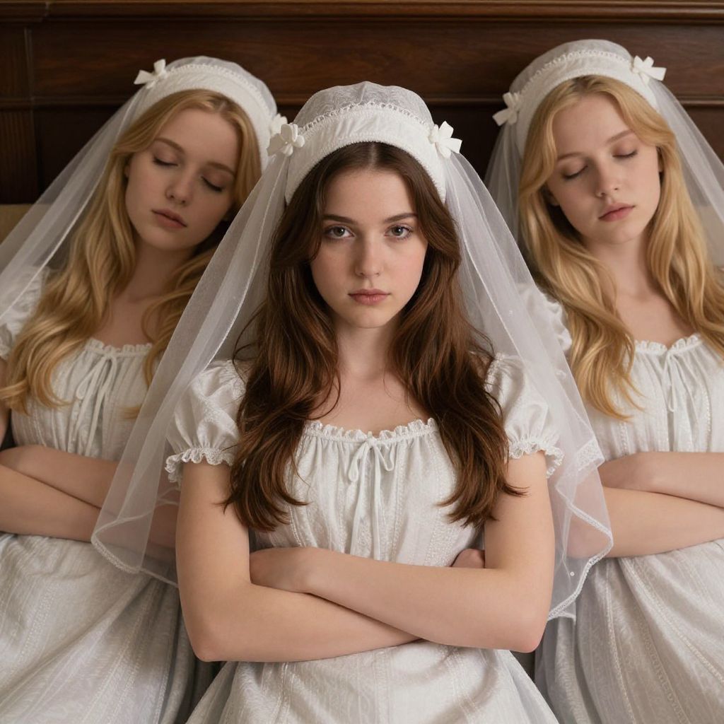 Sleeping beauty godmothers, 1girl, solo, dress, realistic, hat, crossed arms, looking at viewer, veil, long hair, brown hair, blonde hair