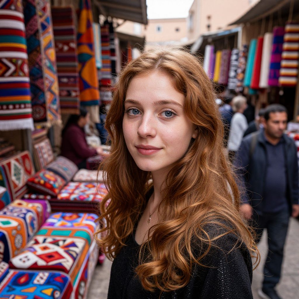A photograph of a young woman with fair skin and long, wavy auburn hair, standing in a vibrant marketplace. She has blue eyes, a slight smile, and wears a black top. The background features colorful, patterned textiles hanging on both sides, with a blurred man in a dark jacket walking behind her. The marketplace is narrow with a cobblestone floor. The textiles display intricate designs with bold colors, adding a rich cultural atmosphere to the scene. The woman is centered in the foreground, with the marketplace stretching out into the background.