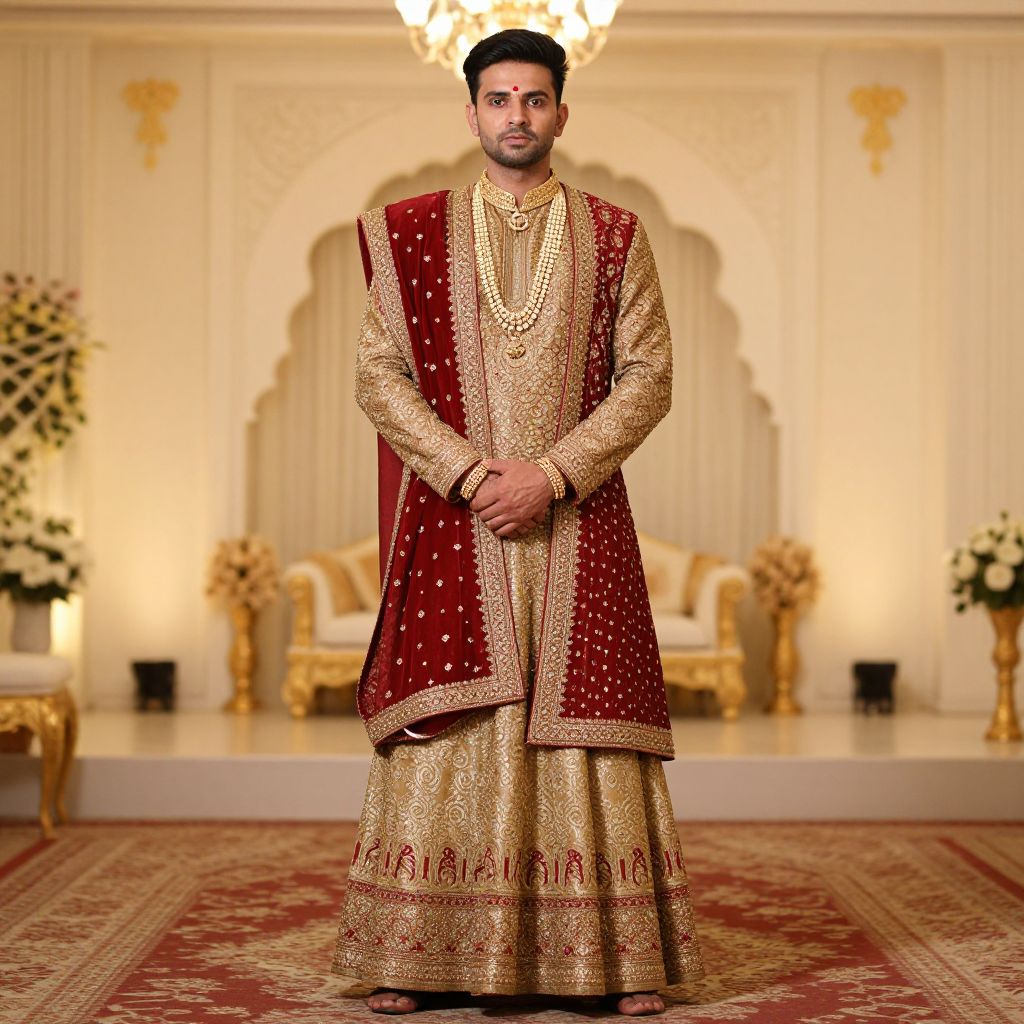 Hindu Marriage Costume, a man in a red and gold outfit standing in a hall