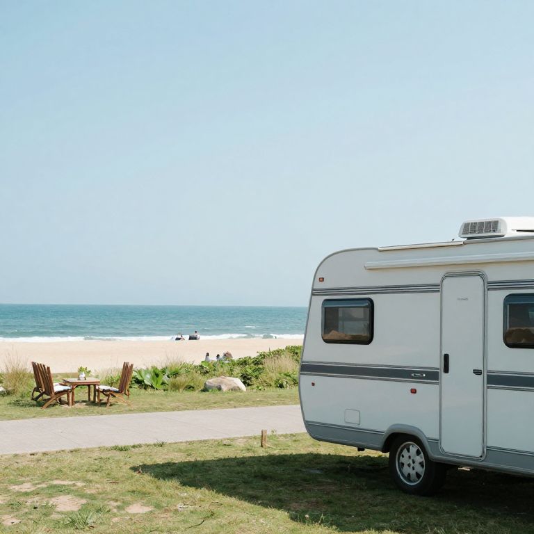 Photograph of a serene beach scene. On the right, a white, older-model RV with gray stripes and a small vent on top is parked on green grass. In the background, the blue ocean meets a pale sandy beach under a clear, bright blue sky. Two wooden beach chairs with green cushions are positioned near the grassy area, facing the ocean. A narrow, light-colored path runs horizontally across the bottom of the image, separating the grass from the sandy beach. The scene is peaceful and sunny, evoking a relaxed, vacation atmosphere.